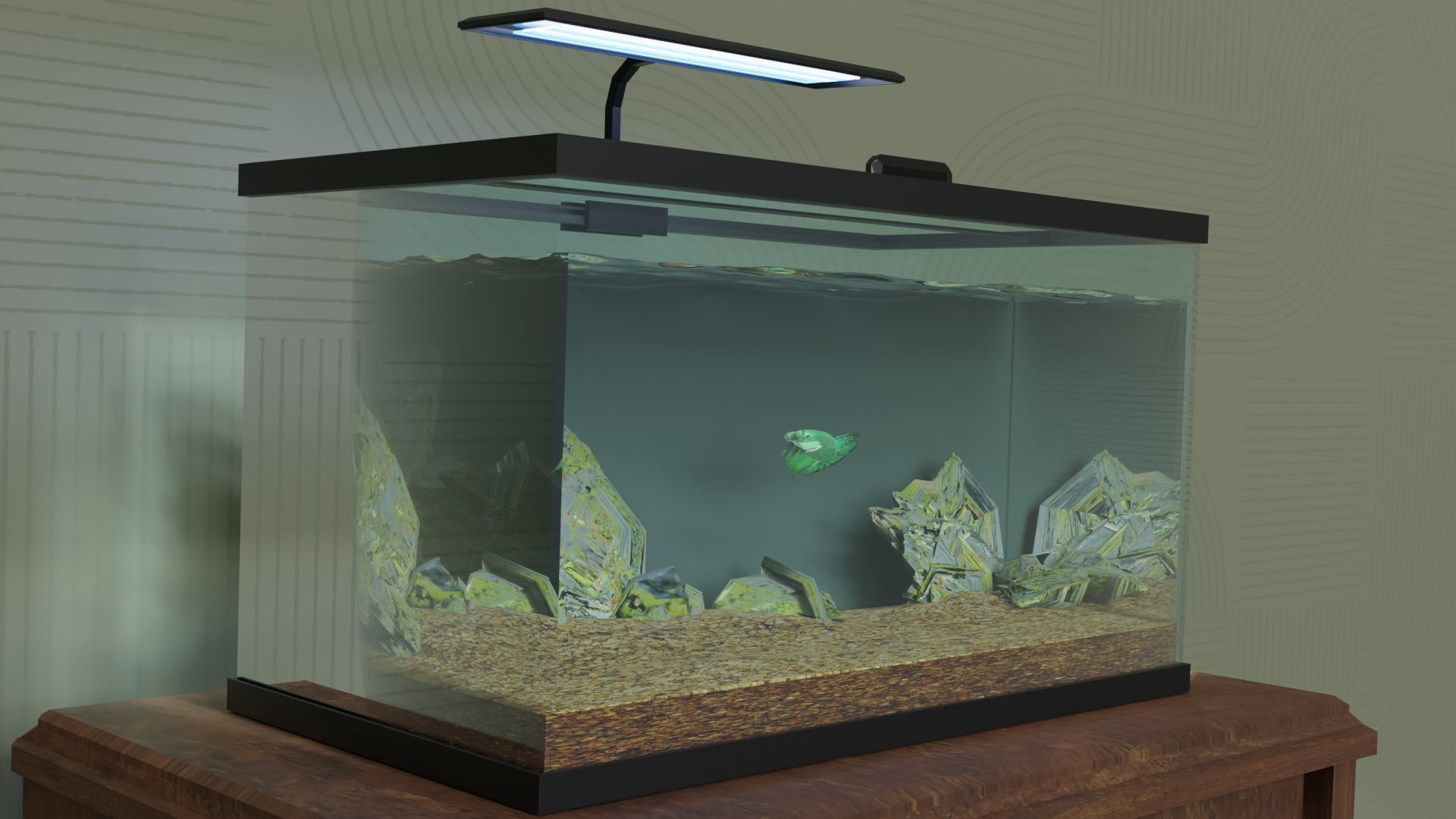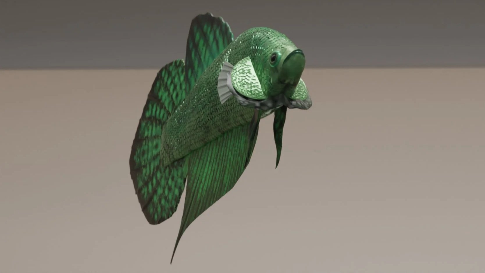 3d sculpted model of a green Alien Betta fish. Scales are stamped into the model to emphasize texture. I referenced videos, photos, and my own experience with taking care of a betta fish as I created my models. The water is simulated to imitate the movement from a filter.