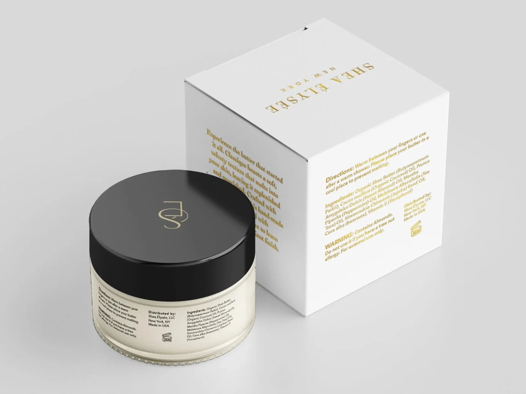 A paid packaging mockup commission for a body lotion product. The text and logo elements on the box are debossed and a metallic gold. The top of the jar has a printed metallic gold logo to match the box. The logo elements: “Shea Élysée - New York” and the “SE” logo were provided by the client. Multiple iterations were sent to the client.